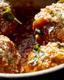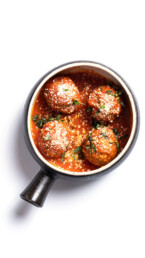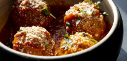 BRAISED MEATBALLS · CHERRY TOMATO SAUCE · PARMIGIANO REGGIANO